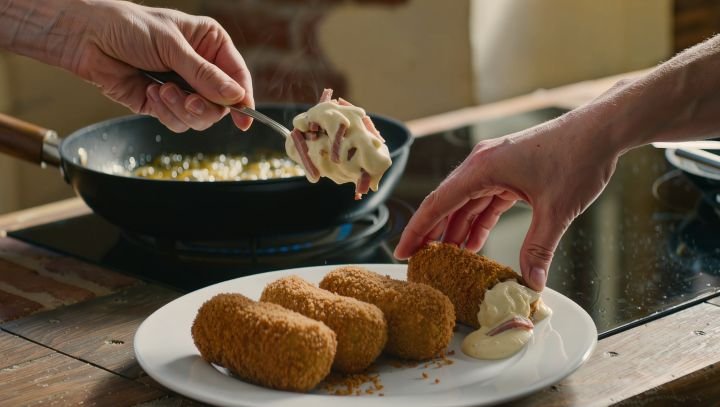 O Béchamel espesso é misturado com carne, peixe ou presunto antes de ser empanado e frito.