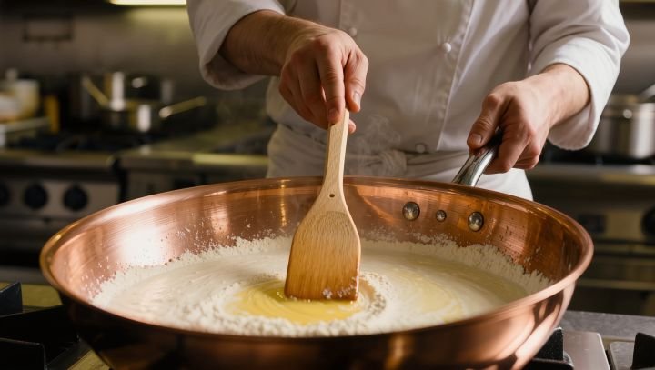 O roux deve cozinhar durante alguns minutos para eliminar o sabor cru da farinha, mas sem dourar demasiado.