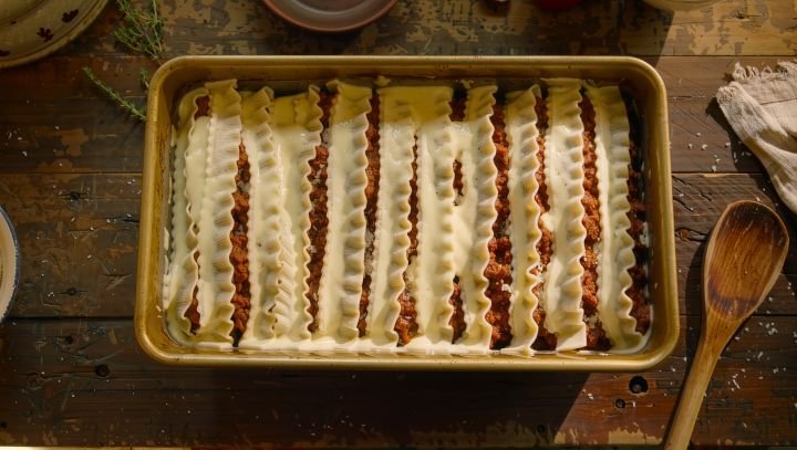 Neste prato, o molho cria camadas cremosas entre a massa, o molho de carne e o queijo.