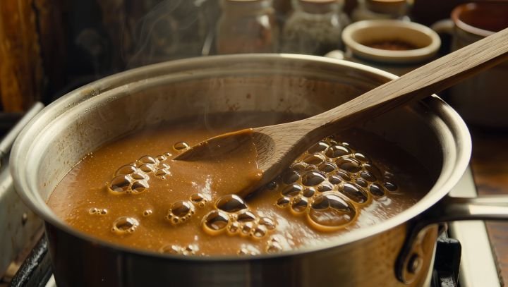O molho é cozinhado até atingir a consistência desejada.