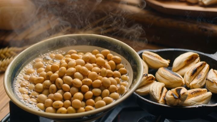 A soja é cozida até ficar macia, enquanto o trigo é tostado e triturado.