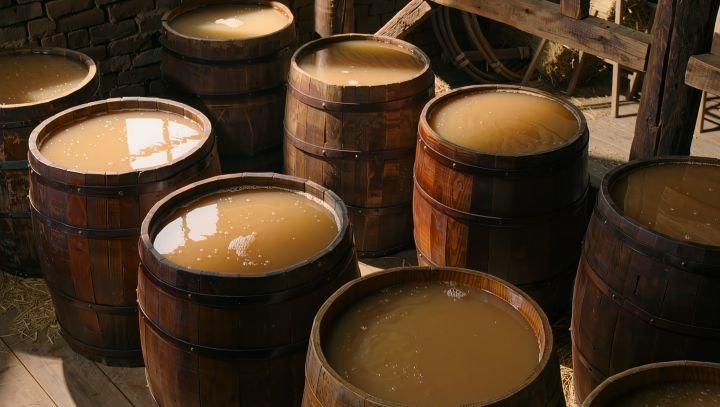 A mistura é mexida regularmente para garantir uma fermentação uniforme.