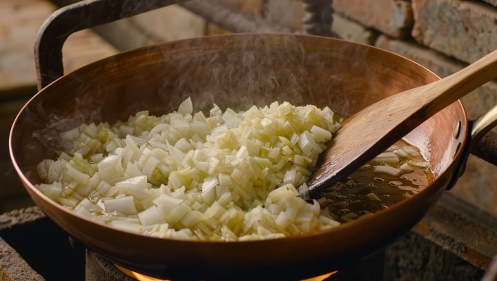 A cebola é normalmente refogada no início da preparação.