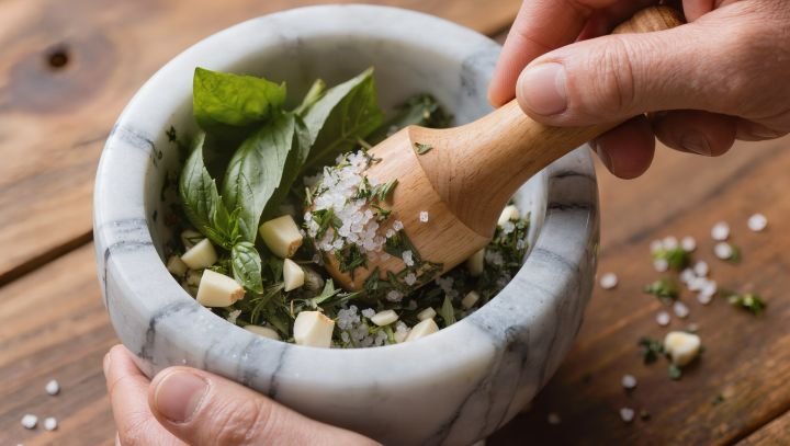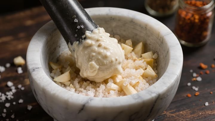 O alho é esmagado com sal num almofariz, criando uma base aromática.