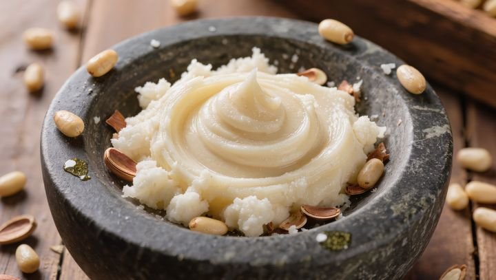 A preparação tradicional do pesto é um processo artesanal que privilegia a técnica e o cuidado com os ingredientes.