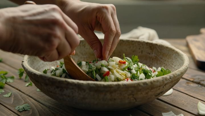 O preparo da Salsa Criolla é simples, mas requer atenção ao equilíbrio de sabores e à frescura dos ingredientes.