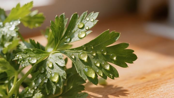 A salsa é lavada e bem seca. O alho é descascado, e os restantes ingredientes são preparados.