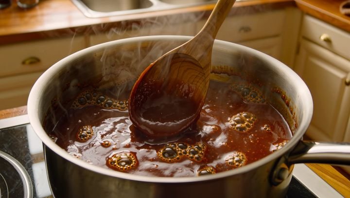O molho é deixado a ferver suavemente até reduzir e engrossar ligeiramente. Durante este processo: